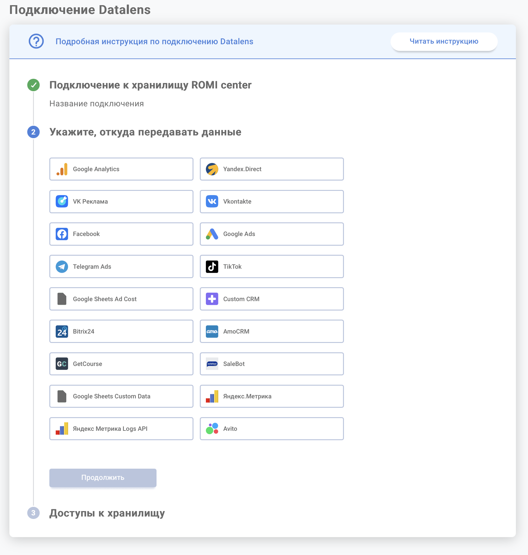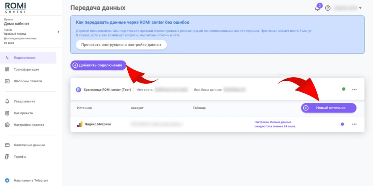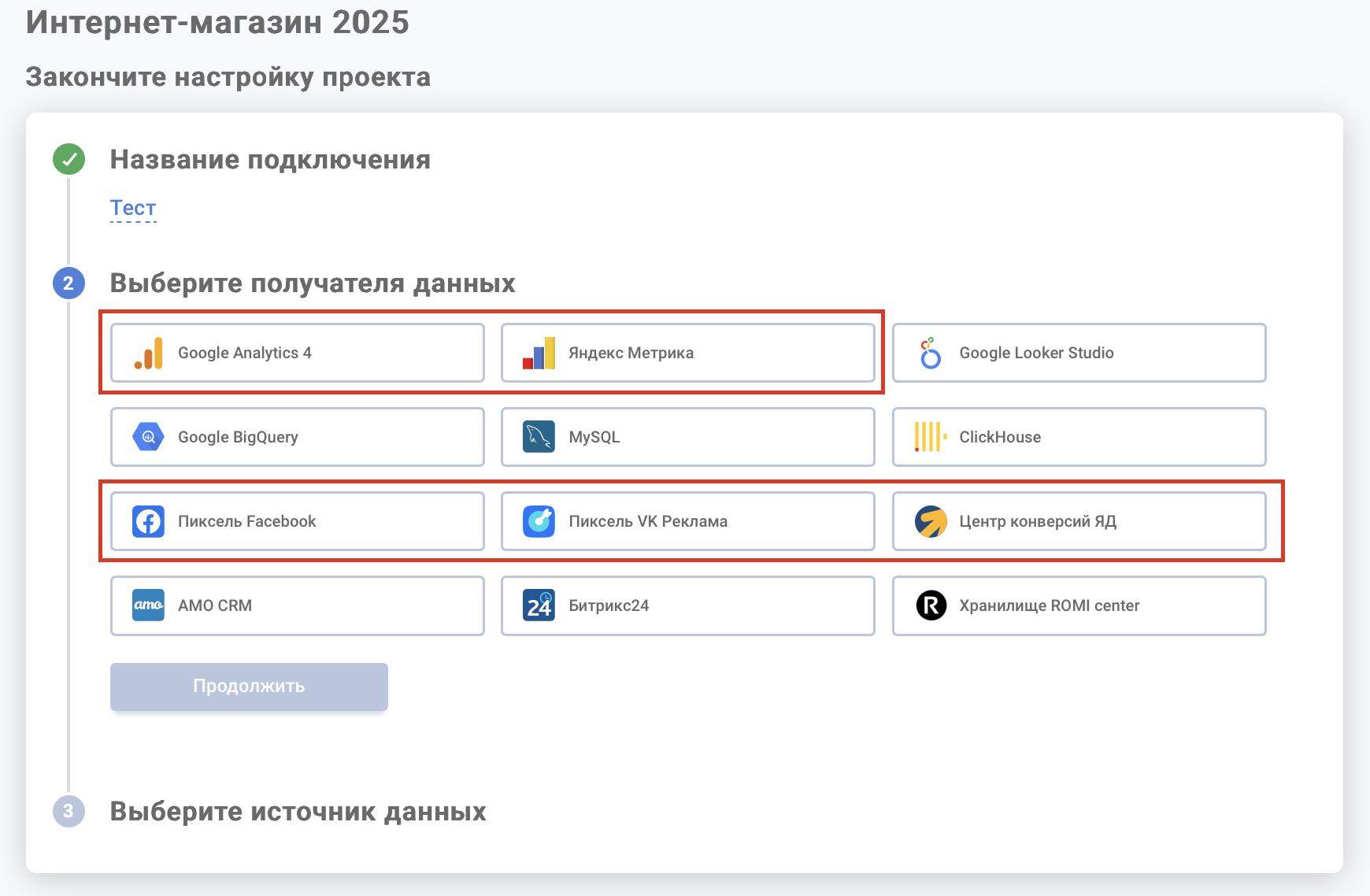 Интеграция данных в ROMI сenter состоит из двух этапов: сначала нужно подключить получателя данных — куда данные будут передаваться, а затем выбрать источники (откуда данные будут загружаться). Такой подход обеспечивает точное разделение каналов поступления и хранения информации.