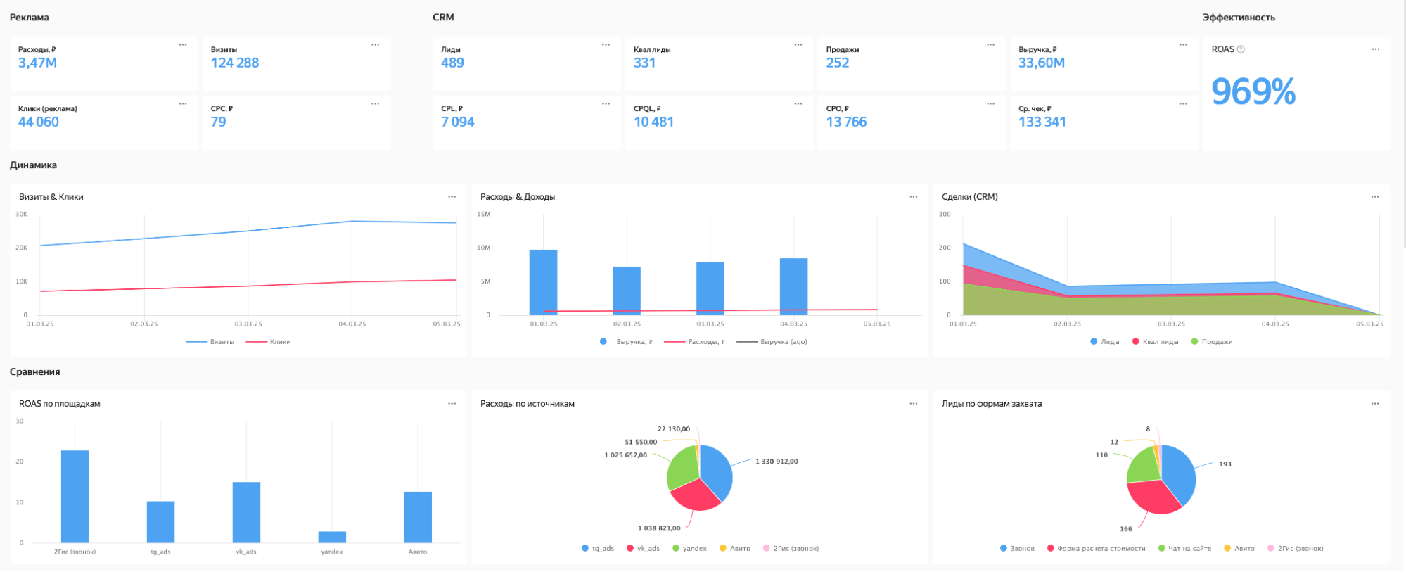 Эта BI-система с легкостью подключается к Хранилищу ROMI center, где хранятся трансформированные данные, и позволяет взять только нужные для отчетности параметры. Как может выглядеть дашборд по сквозной аналитике: