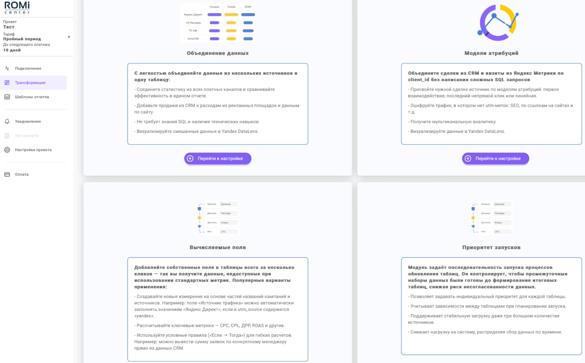 Раздел «Трансформация» доступен в личном кабинете ROMI center и позволяет обрабатывать данные, исходя из различных маркетинговых задач. Расскажем коротко о возможностях каждого инструмента.