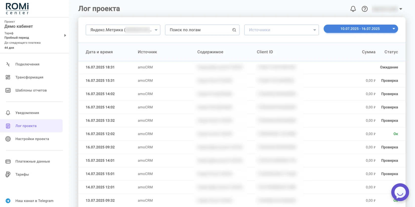 После того как подключение создано и настроено, статус передачи данных можно отслеживать в личном кабинете ROMI center, раздел «Лог проекта».