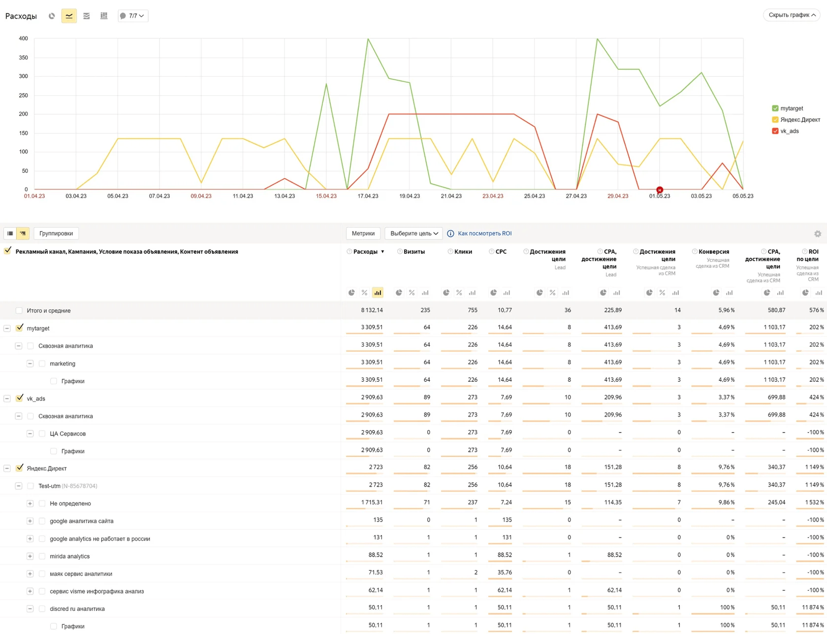 Все табличные данные отображены в графическом формате и понятны как интернет-маркетологу, так и руководителю направления рекламы, глубоко не погруженному в механику сбора сквозной аналитики.
