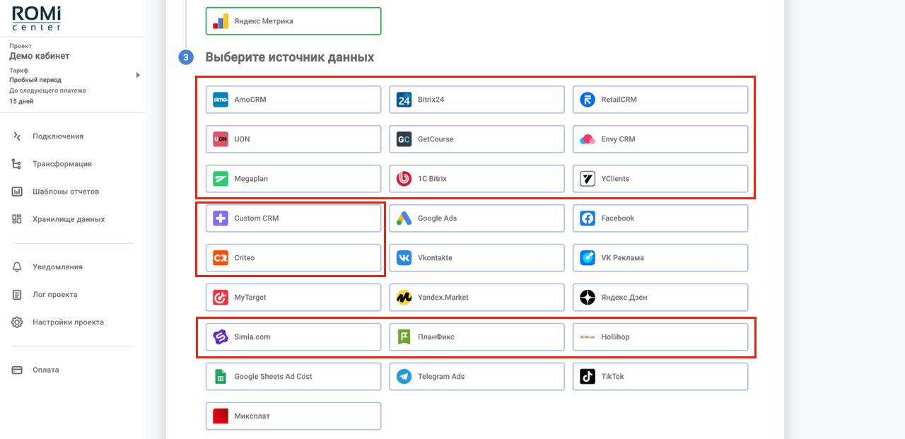 2. Подключить рекламные площадки напрямую для передачи данных в Хранилище с помощью коннекторов ROMI center.